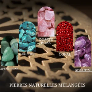 • Pierres naturelles : Quartz rose, Aventurine, Améthyste, Turquoise, Corail